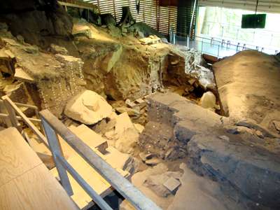The earliest remains from Meadowcroft did not come from excavations within the drip-line of the rockshelter. Most came from the area excavated beside the Old Roof Fall, shown here on the right.