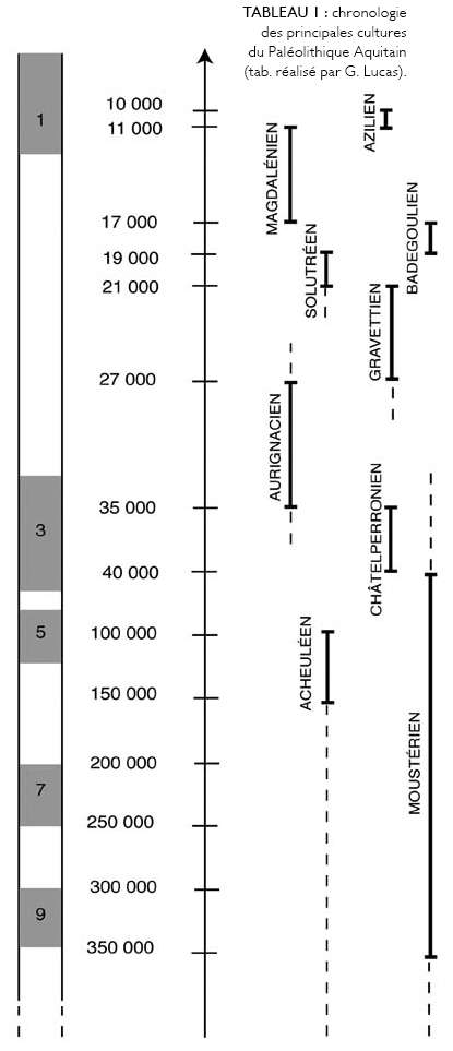 Laville (1973) assigns these last to a cold phase of the beginning of the Riss I. It is this interpretation that prevailed in 1986 at the resumption of excavation work carried out by A. Debénath and J.Ph. Rigaud