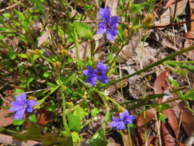 It is an erect multi-stemmed plant to 1 m (4 ft) high with obovate to elliptic leaves which are 9 to 60 mm (0.4-2.4 in) long and 5 to 42 mm (0.2-1.7 in) wide. The stems and undersides of leaves are covered in fine hair and rough in texture, while the leaves are bare of hair when mature. The flowers are mainly produced between August and January in the species' native range. Three to five flowers arise each on groups of two to nine flower-bearing branches. Reaching 25 mm (1 in) in diameter, they are generally blue-purple in colour with yellow centres, though pink and white flowers have been recorded.