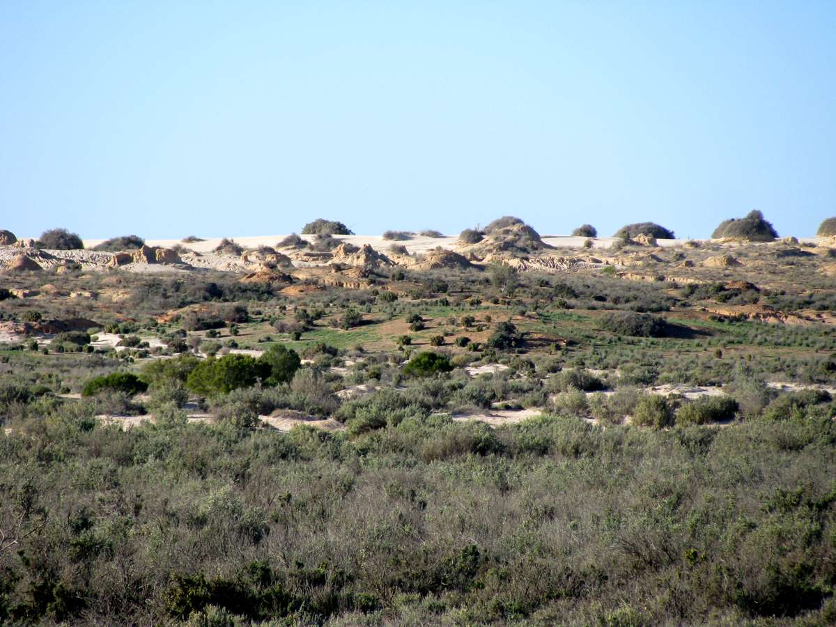 The lunette dune to the east was much better covered before 1864. Here there was scrubby woodland of bright green Sandhill Wattle, weeping green Butterbush, dark pyramids of Murray Cypress Pine, tangled clumps of mallee and on the floor, bluebush, hopbush, Woolly Darling Pea and native grasses.