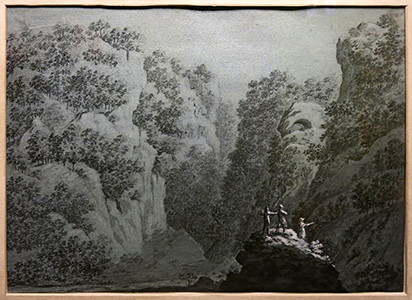 This drawing by the Rotterdam artist Gerardus Johannes Verburgh, 1803, is the oldest known depiction of the Neander Valley with the Neander Cave. The hikers are facing west, looking downstream along the Düssel River. They are standing on top of the 'Engelskammer' or 'Rabenstein' rock formation on the right of the Düssel. The Feldhof Cave was situated on the opposite side.