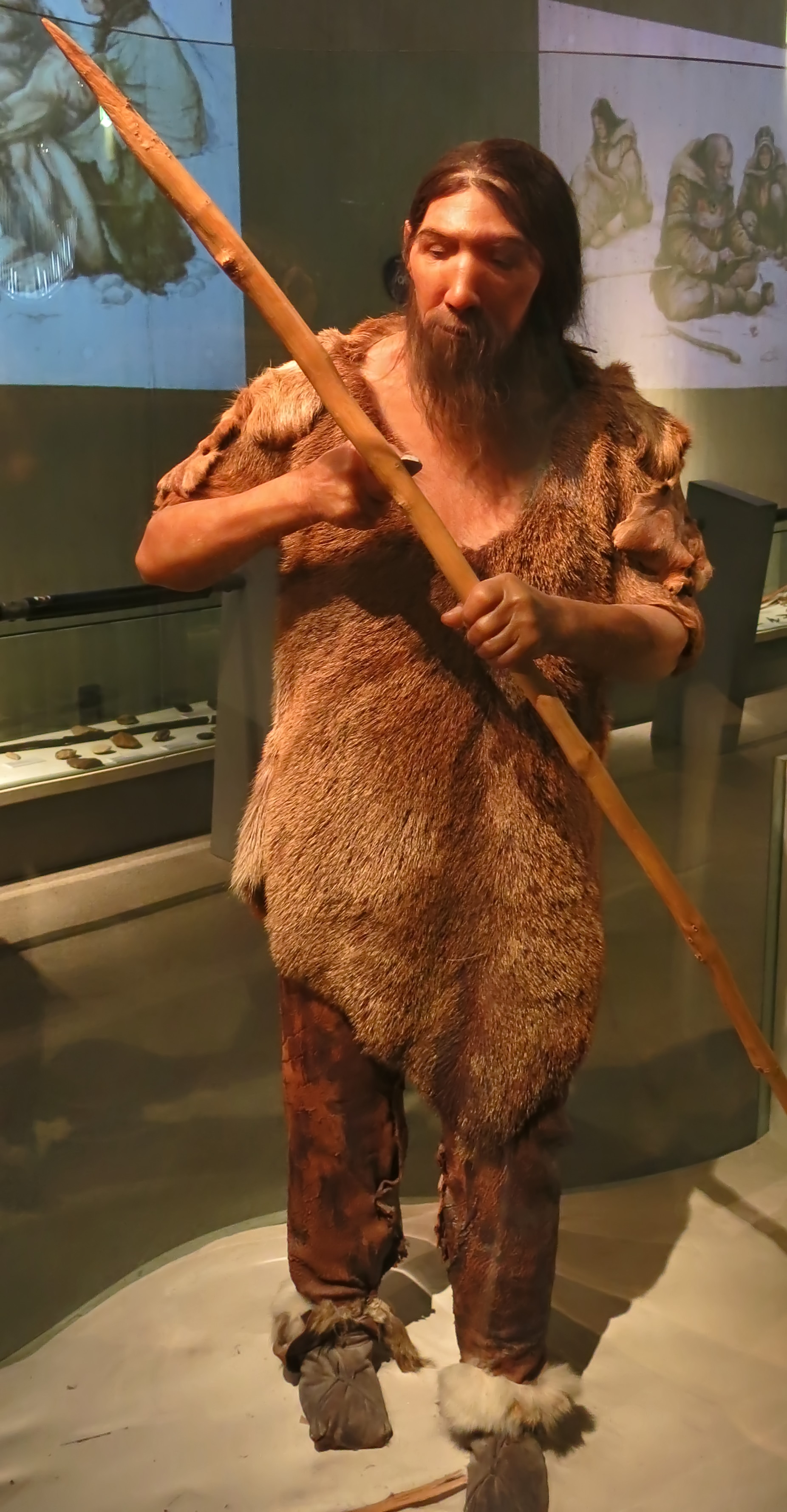 These excellent models of the type specimen Neanderthal, apparently by the same sculptor/atelier, show the clothes likely to be worn in what was for much of the time very cold conditions. Neanderthals had a physique adapted to periglacial conditions, but furs would have been essential for survival. They must have been adept at curing, cutting, and sewing pelts for warm clothing and footwear.