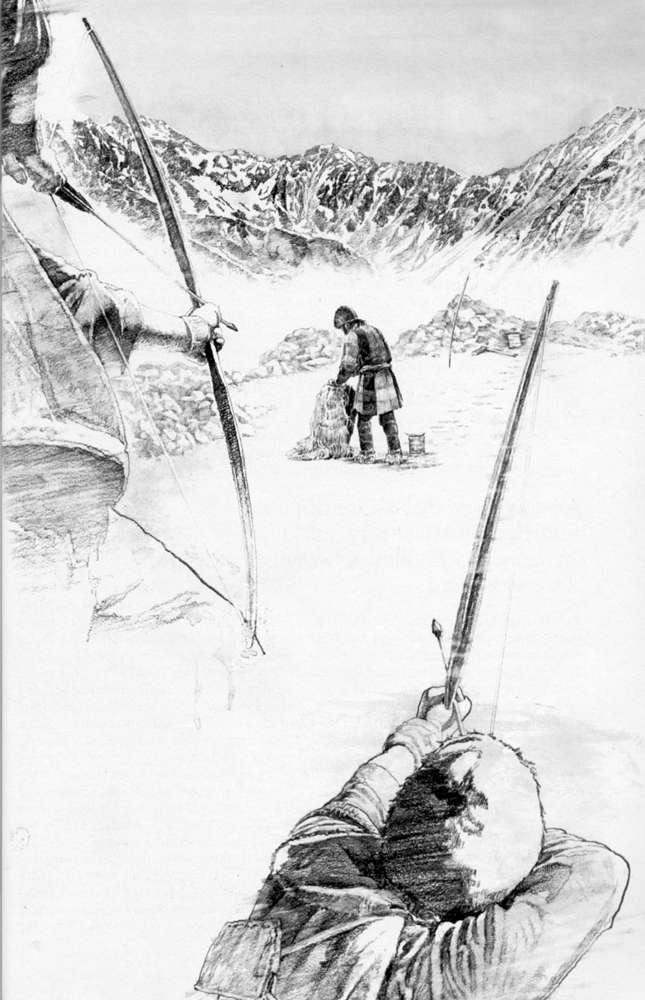 This new medical evidence suggests that an attacker, positioned behind and below his victim, fired a single arrow that struck the Iceman's left shoulder blade—precisely the area at which prehistoric hunters aimed to bring down game with one shot. The arrow went clean through the bone and pierced the artery. Blood instantly began to gush out, filling the space between the shoulder blade and the ribs. In his few remaining minutes of life, the Iceman became a textbook case of what is now known as hemorrhagic shock. His heart started to race. Sweat drenched his garments, even at an altitude two miles (three kilometers) above sea level. He felt increasingly faint because not enough oxygen was reaching his brain. In a matter of a few minutes, the Iceman collapsed, lost consciousness, and bled out.