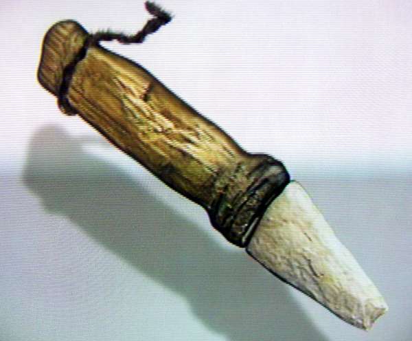 Touching up tool for sharpening flint blades. The handle is made from lime wood, Tilia sp., with a small piece of deer antler hardened in the fire set into it.