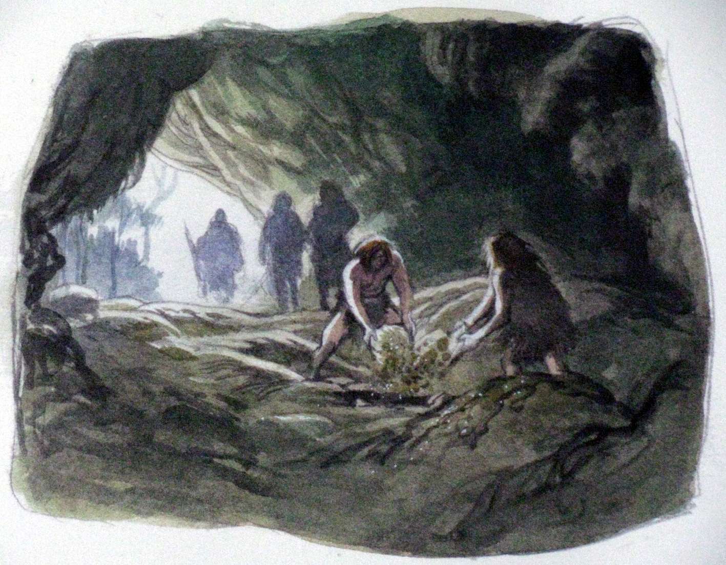 Superb watercolours were done for the Neanderthal exhibition at the Musée National de Préhistoire by the French artist, Emmanuel Roudier.