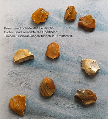 In the subsequent ice age, the site was located in front of the ice sheet edge. The extremely cold climatic conditions have changed the surface of the artefacts in a characteristic way, giving them a patina they would not otherwise have.
