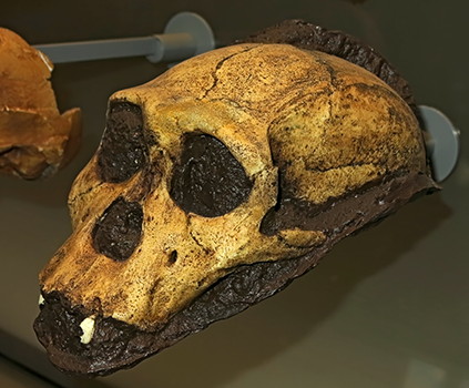 Cranium of the Malapa hominid 1 (MH1) from South Africa, named 'Karabo'. The combined fossil remains of this juvenile male is designated as the holotype for Australopithecus sediba.