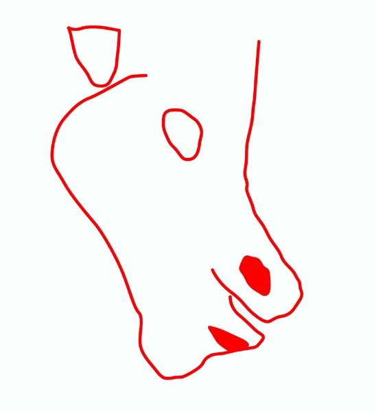 b. Horse 8. Analytic tracing. The red lines indicate modern transformations (rounded abrasion as if a brush was used to clean the rock surface or erase traces, or linear abrasion or engraving, to trace a new head with its tuft and neck) (tracing E. Bougard).