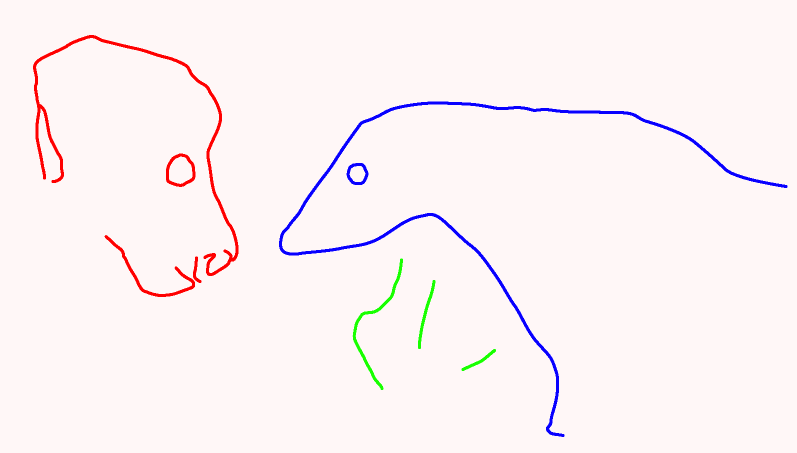 First bison in yellow, later bison in red, apparently unrelated carvings in purple.