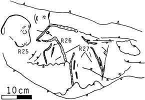 A hooked line outlines a nasal appendage. The eye is rhombic. The ear is not represented. The chin is receding. An important concavity crosses the cheek, while the rest of the face is on a flat surface. Despite these few details, the head is exactly the same type as the head R24. They both have dimensions of about 10 cm by 10 cm as does the sorcerer's head, of R18. The head 25 is etched face to face with the horse R27. This association is indisputable, which supports the existence of a relationship between the human head and the horse emphasised by A. Leroi-Gourhan. However, this Saint-Cirq tête à tête does not support the hypothesis of an identification of the horse as a male symbol.