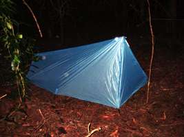 If you go on overnight hikes at a time when you know that the probability of fine weather is close to 100%, you won't have to worry about rain, and this will keep the dew off. If it does rain, it will still work well unless there is a lot of wind with the rain, though I'd set it up closer to the ground than in this photo, and with the front corners a little closer together to give head room. It is about as light as you can get for a durable tent, and it packs away into almost nothing. I'd make it out of silnylon if that is available, but any waterproof fabric is fine. You will need to find a light strong stick for the pole where you camp, always an option in Australia, as shown in this photo, or carry one.