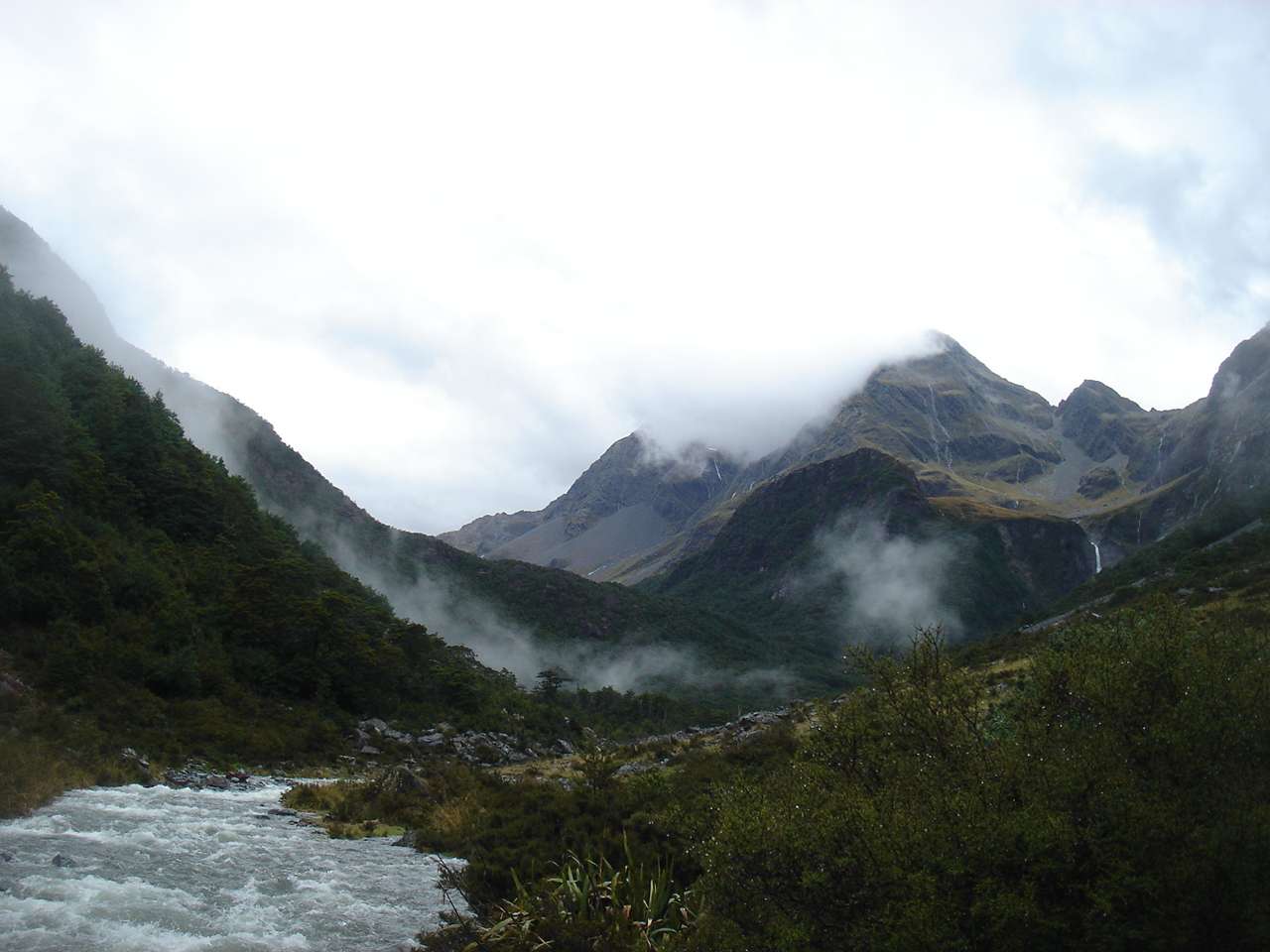 After spending the night in West Sabine Hut lulled to sleep by the heavy rain on the roof, we left early the next morning, and walked into very heavy rain, on our way to Blue Lake. We soon encountered the results of the overnight and present heavy rain. Every sidestream (such as this one!) was running a banker, and sometimes great care had to be taken to get across safely.