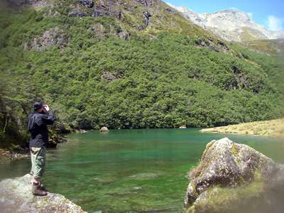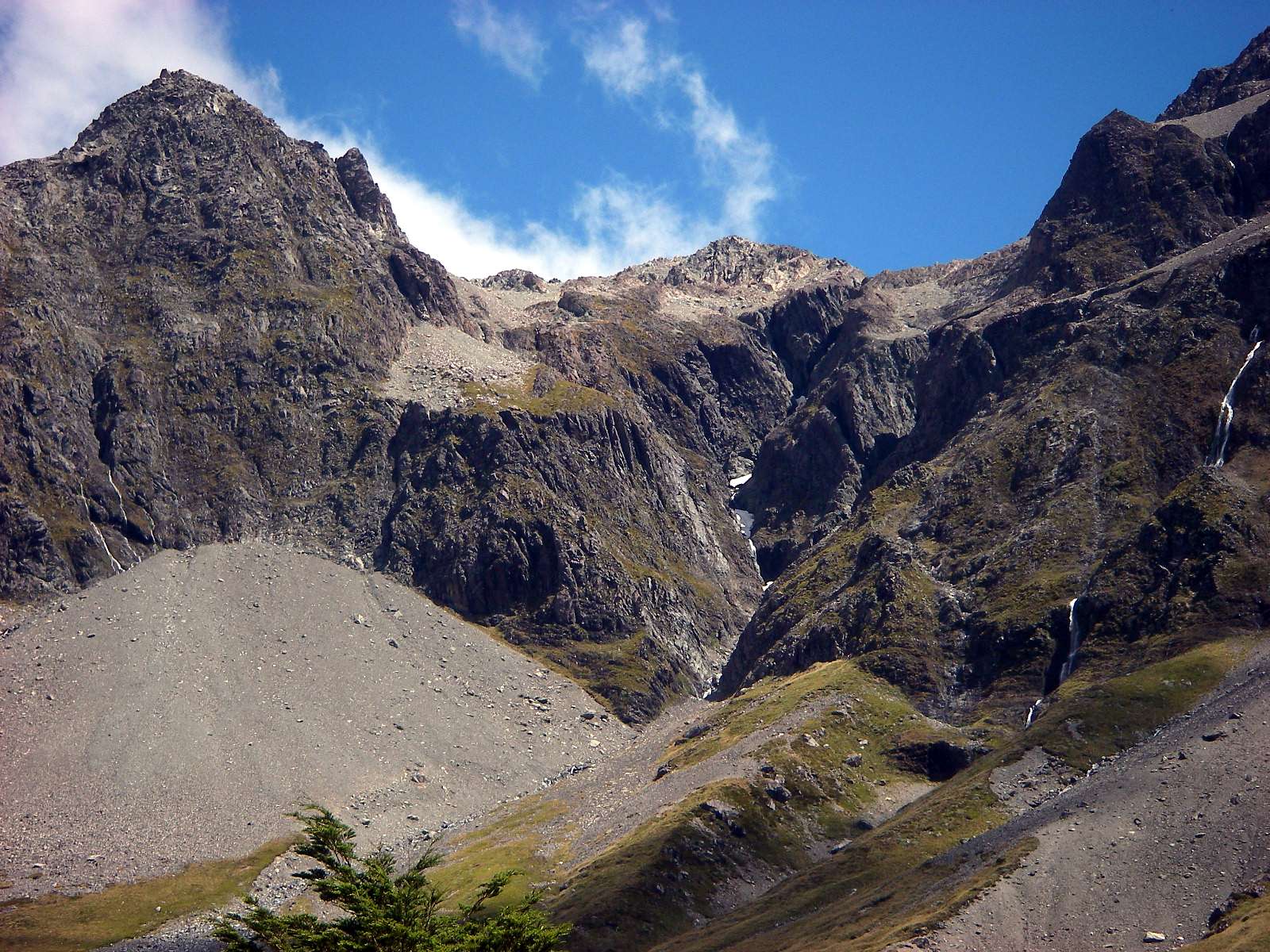 Day Four of the Travers Sabine Circuit in New Zealand - John Tait Hut to West Sabine Hut over the Travers Saddle. It is a steady climb to Upper Travers Hut, but the view of Mount Travers from the valley bottom is spectacular. Travers Falls is a beautiful little 20 metre high waterfall. From Upper Travers Hut the way leads up the Saddle, with some steep sections. There are many beautiful alpine plants such as Hebe, Celmisia, Gentiana, Helichrysum, Coprosma, vegetable sheep and New Zealand flax on the eastern side of the saddle. On the saddle itself there are some beautiful large tarns, but the area is exposed and often windy and cold. The track drops down into the East Branch of the Sabine, via a steep scree slope. The area is subject to avalanches after heavy snow.