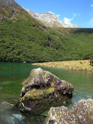 Day Six of the Travers Sabine Circuit in New Zealand - Blue Lake to Lake Rotoroa. The East and West Sabine rivers drain each side of the Mount Franklin massif, and the West Sabine drains Lake Constance and Blue Lake. They join at Sabine Forks, and the Sabine then flows into Lake Rotoroa, in the Nelson Lakes National Park. It is a beautiful stream bordered by beech forest, with lichens and fungi under the trees. A tramping track runs along the river and forms the western branch of the Travers-Sabine tramping circuit. It connects Lake Constance and Blue Lake with Lake Rotoroa and Lake Rotoiti. Three tramping huts are located in the Sabine Valley: Sabine Hut, West Sabine Hut, and Blue Lake Hut. Lake Rotoroa is fed by the D'Urville and Sabine Rivers. A track follows the north east side of the lake, and another track leads back via Speargrass Hut to St Arnaud. A water taxi can ferry trampers to and from the head of the lake. The lake has trout, and attracts recreational fishermen.