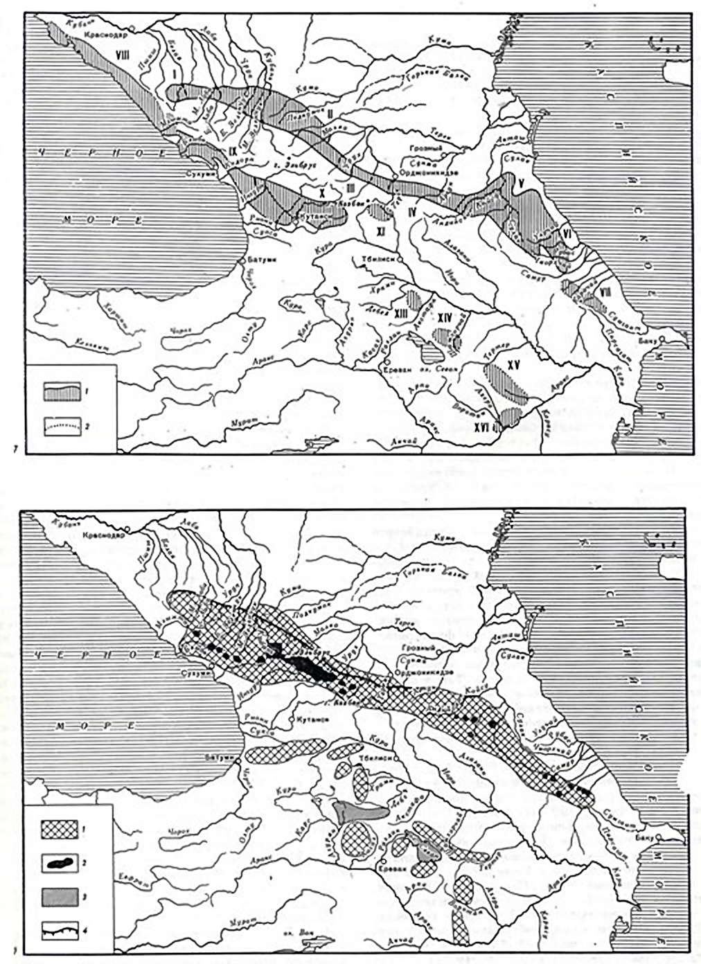 I - array - Fisht Oshten-Lagopaki in Montenegro; II - the western part of the cuesta band ; III - the eastern part of the cuesta band ; IV - Transition Region 'cuesta-fold' as for the Andean mountain range; V - a limestone region of internal Dagestan ; VI - limestone-karst region of southeastern Dagestan; VII - cave area of Shahdag; VIII - the north-western region of the Black Sea coast; IX - Sochi -Abkhaz region; X - West Georgia area; XI - on the Dividing Range; XII - the northern slope of the western Caucasus; XIII - Western region of Azerbaijan; XIV - Dashkeskanskaya area; XV - Tutgunchay-Shusha region; XVI - Zangelayao-Fizullinskaya area.