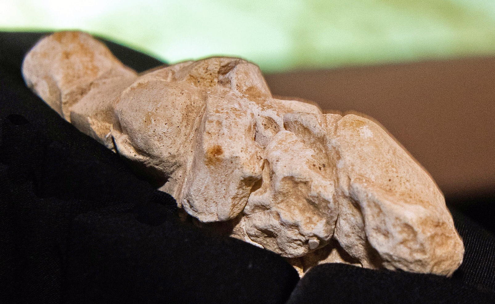 A person points to a 23 000 year-old limestone statue of a woman called the 'Venus of Renancourt' which was found at the palaeolithic site of Renancourt, France, November 27, 2014