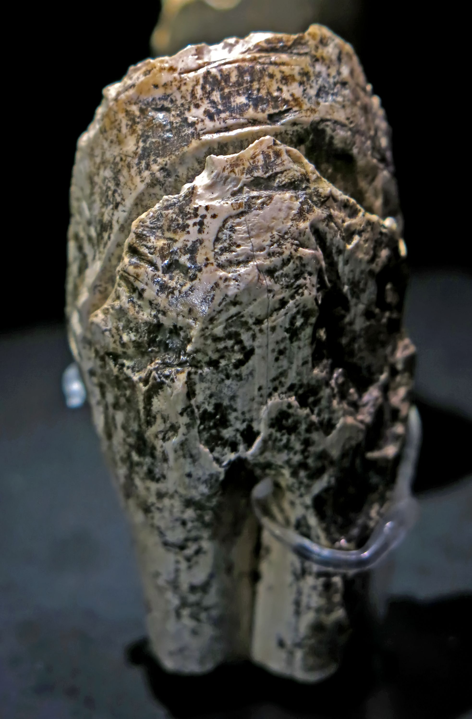 (left) as found at the site, (right) cleaned up for public display. On the right and left of the head are small incisions which represent the tusks.