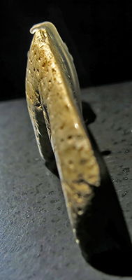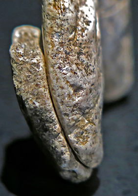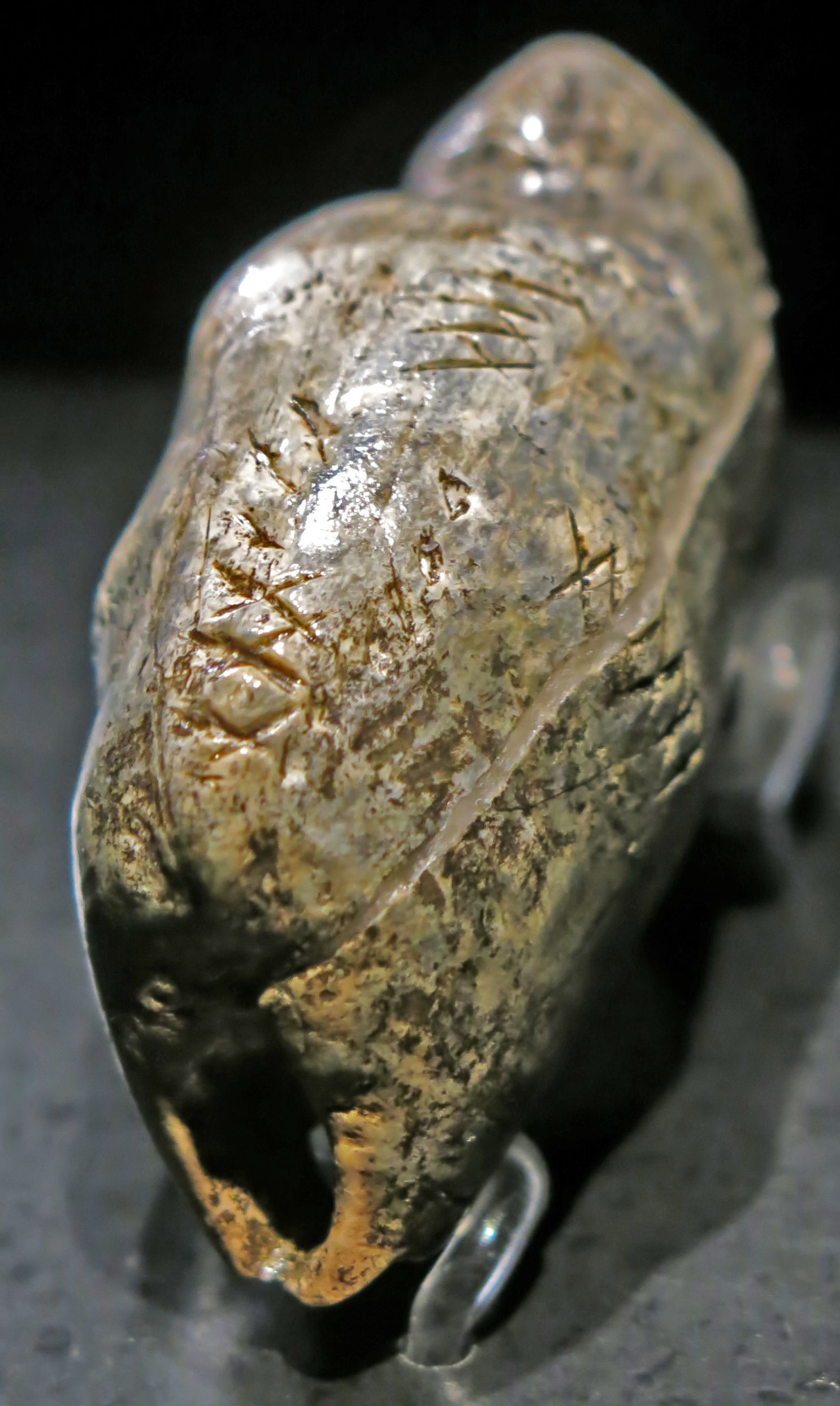 Here we can see clearly the natural striations created by the structure of the ivory when part of it has split off. This splitting appears to have happened in antiquity, judging from the patina on the striations feature, and the fact that some carving marks cut into the striations.