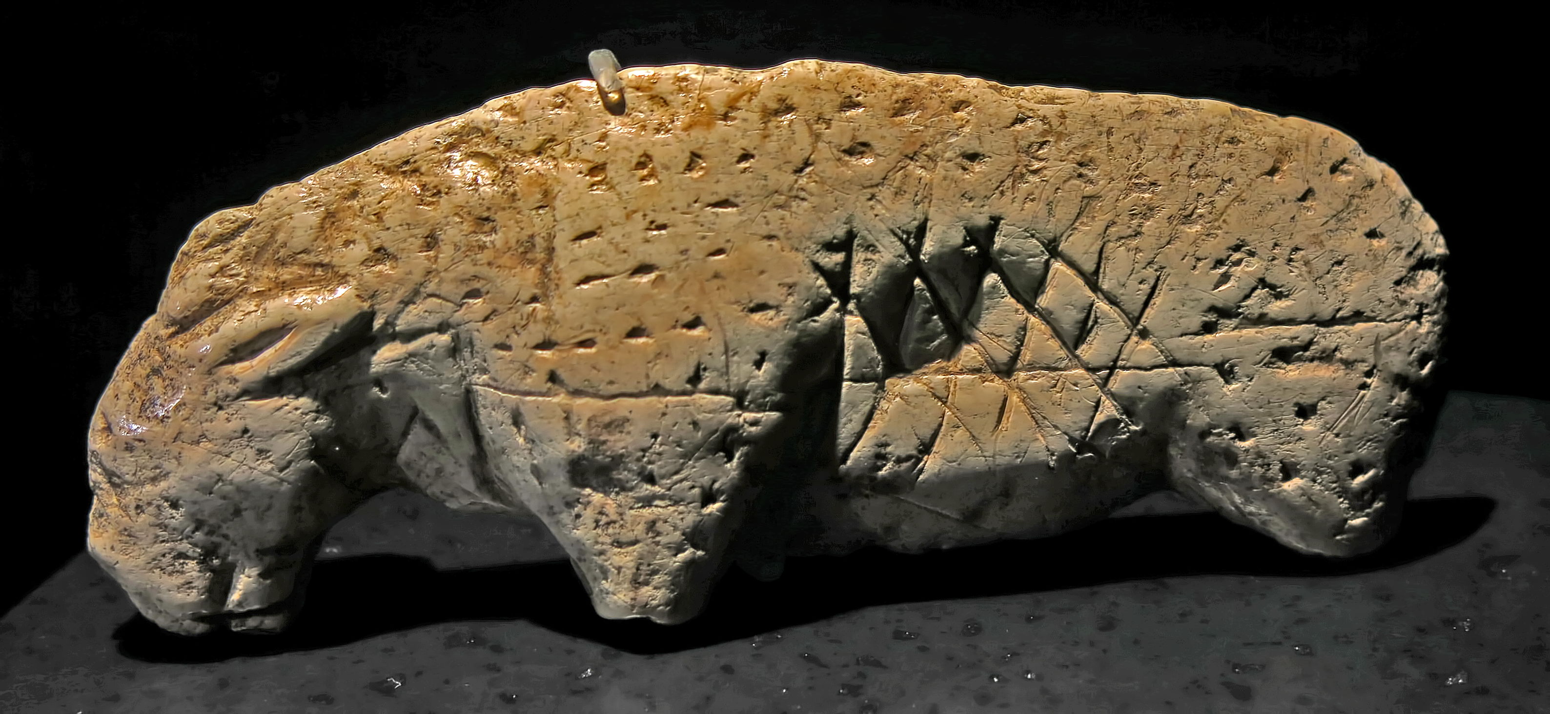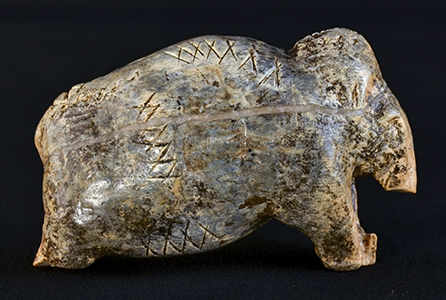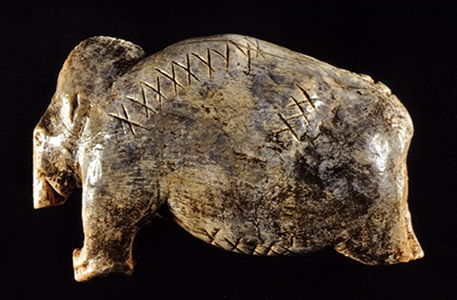 This closeup of the front of the bison figurine shows that the same segmentation decoration has been used on the head of the bison as on the back of the neck of one of the Cave Lion figurines.
