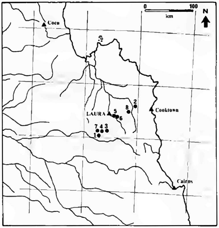 Map of part of Far North Queensland showing the location of the Laura River rock art sites.