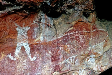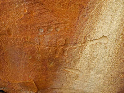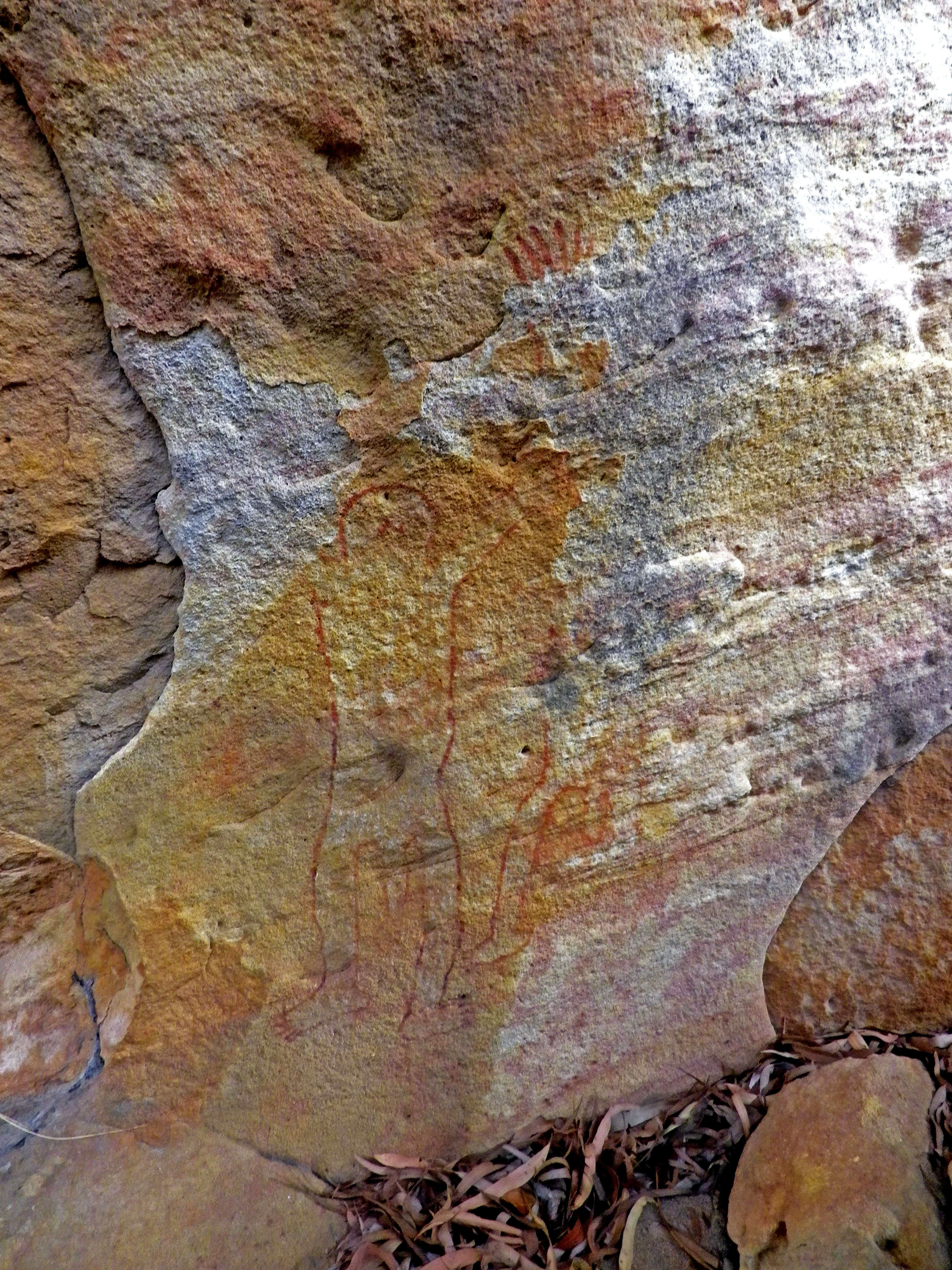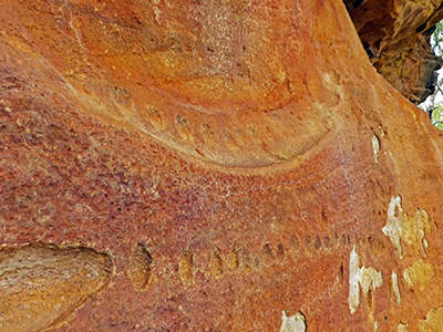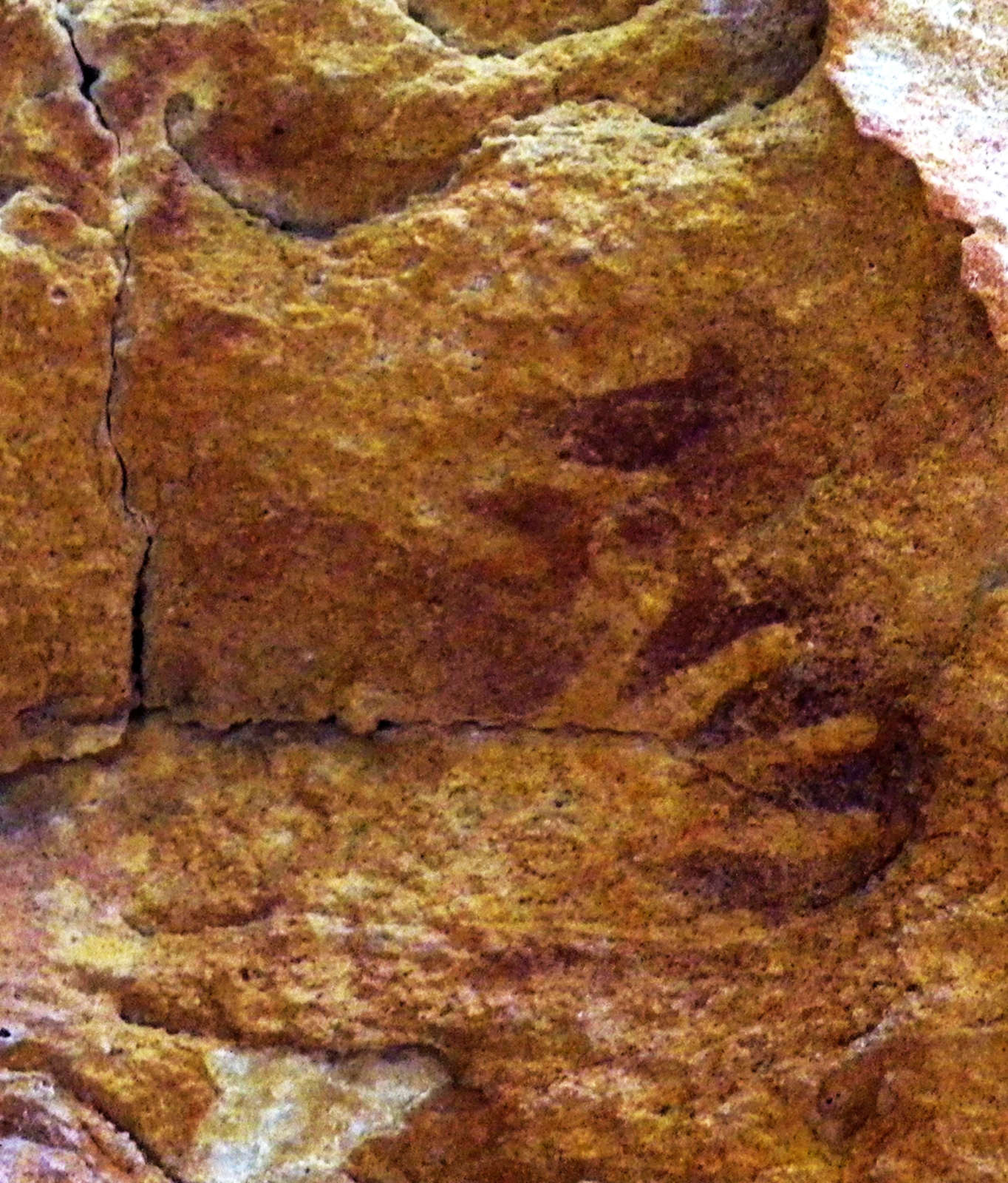 The vertical lines of red ochre in the centre of this image, and much faded red dots on the left are of unknown significance.