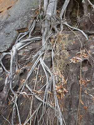 A native fig tree, showing the characteristic aerial roots covering the rock on which it stands, with pioneer species ferns on the rock as well.