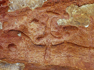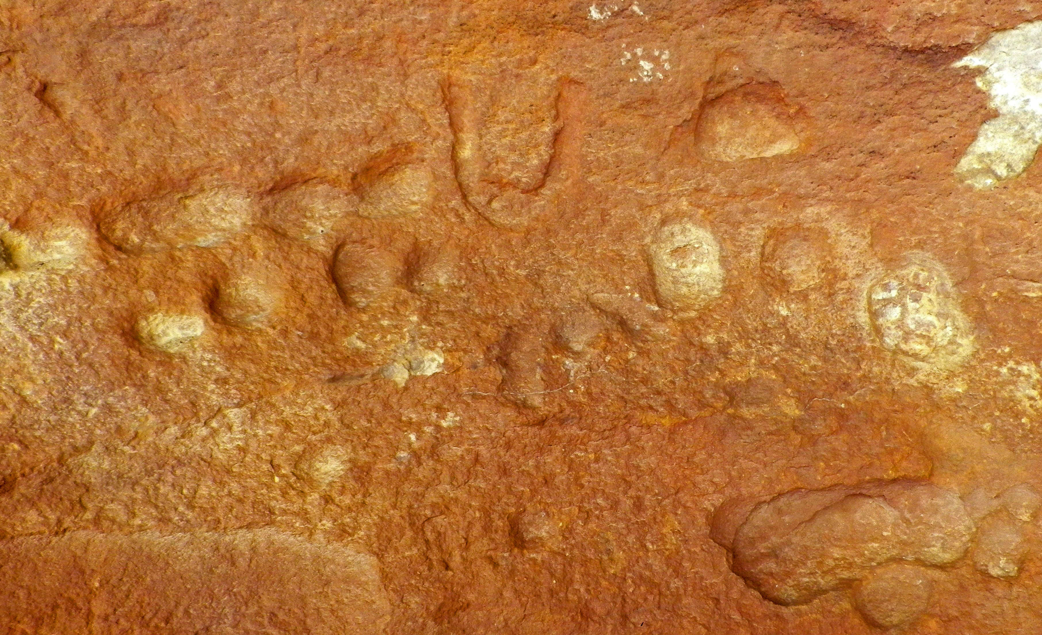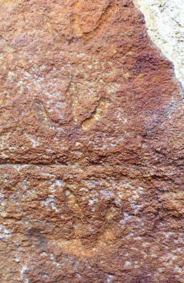 Emu tracks and legs carved into the rock surface. Emus would have been a very important resource for the aborigines of the area, and were relatively easily hunted. Their curiosity was often their undoing.