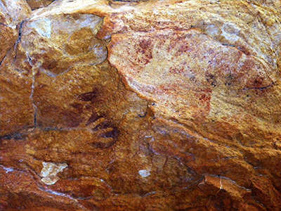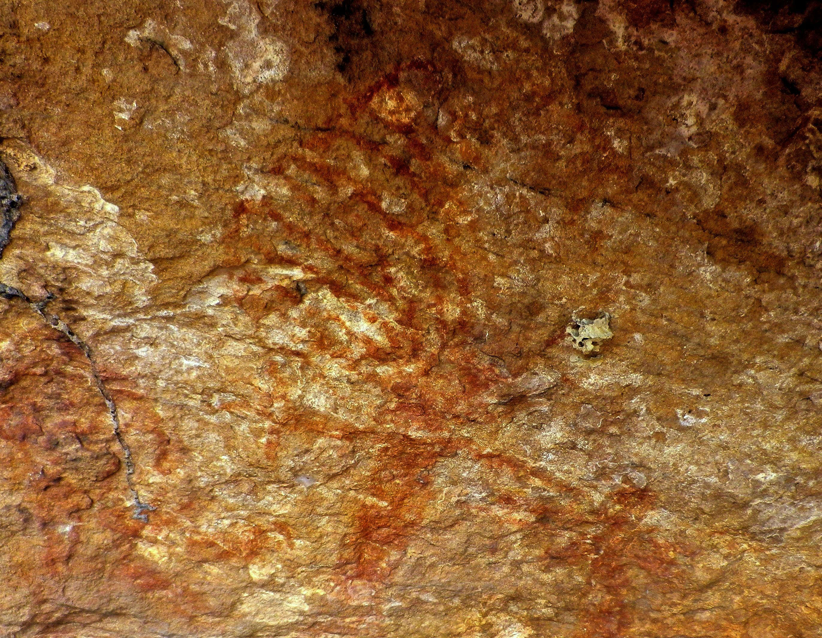 Close up of part of the panel above. Here it is more obvious that the upper negative hand stencil is in white ochre, while the one below appears to have received a coating of white ochre first, with a brown negative stencil placed on this white background, although it might simply be a positive hand print on a brown background.